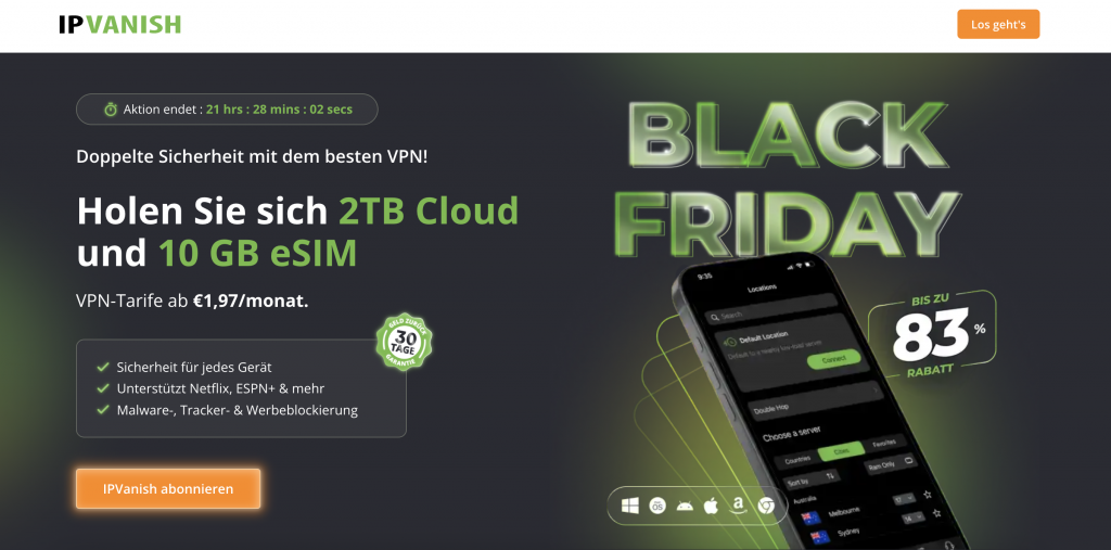 IPVanish ist ein VPN-Anbieter, der Ihren Internetverkehr absichert, Ihre IP-Adresse verbirgt und somit Ihre Online-Privatsphäre sowie Sicherheit stärkt. Der Dienst ist berühmt für schnelle Verbindungen und starke Verschlüsselung, was ihn besonders geeignet für Streaming und Torrenting macht. Er stellt Anwendungen für Windows, macOS, iOS und Android bereit und lässt sich gleichzeitig auf einer unbegrenzten Anzahl von Geräten verwenden.